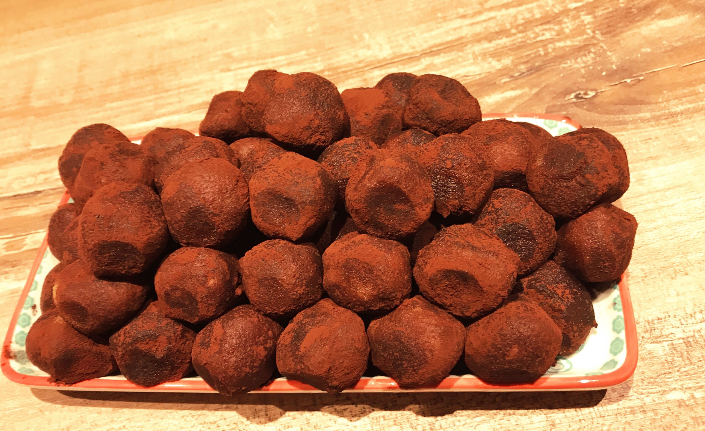 - Danach beliebig große Bällchen formen und diese in dem Kakao wälzen.